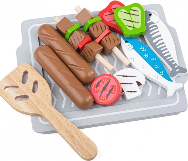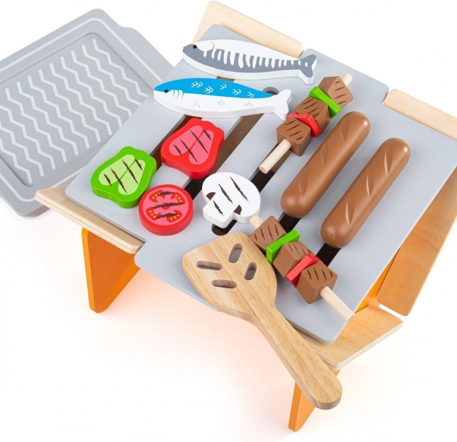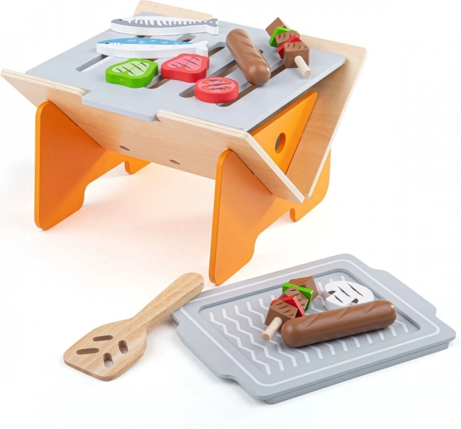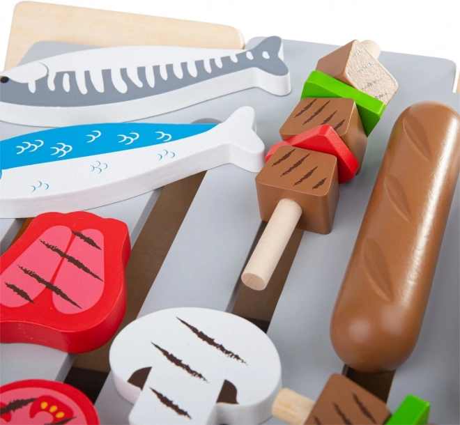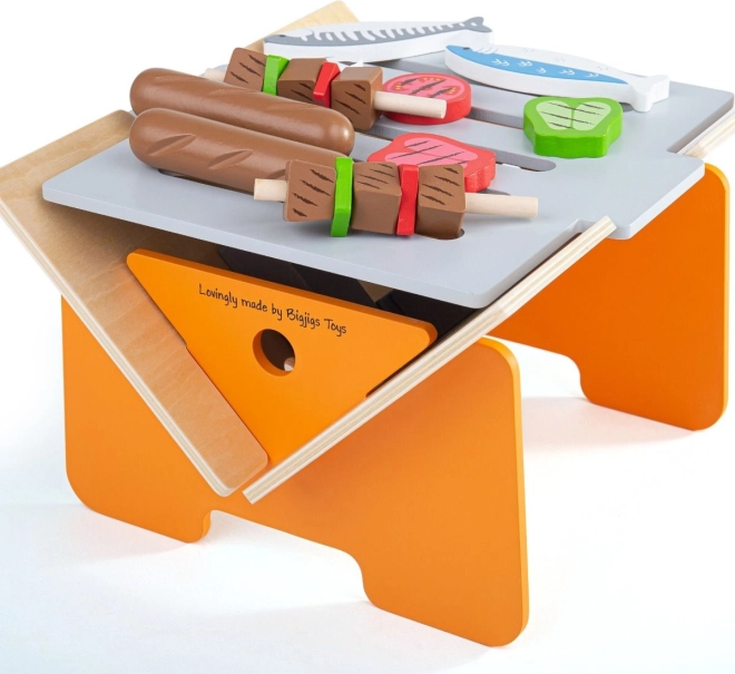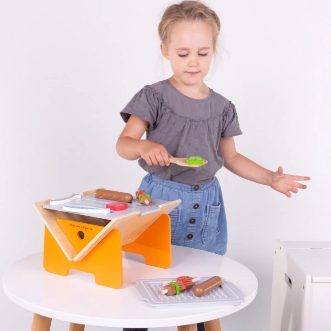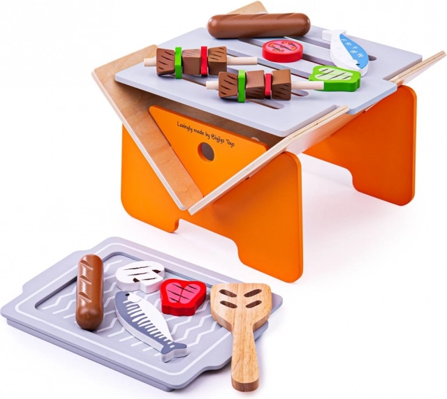 Rendezzen kerti partit Bigjigs Toys fa asztali grilljével! Tartalmaz 10 darab ételt, lapátot, tálcát és faszenet. Könnyű összeszerelés csavarok nélkül. Fenntartható anyagokból készült.