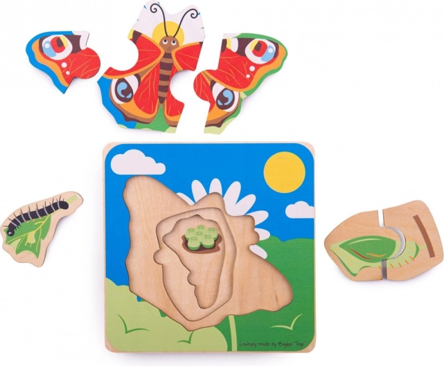 Ez a réteges fa puzzle ideális taneszköz a kis felfedezőknek. A gyerekek lépésről lépésre megismerik, hogyan lesz a tojásból hernyó, bábból pedig végül gyönyörű pillangó. A négy rétegnek és a masszív elemeknek köszönhetően az összerakás intuitív és szórakoztató.