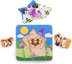 A réteges felépítés fokozatosan változó képekkel szemlélteti a fejlődési szakaszokat – a tojástól egészen a kifejlett méhig. Az elemek mérete a gyerekek kezéhez igazodik, a masszív kivitel pedig a gyakori használatot is jól bírja.
