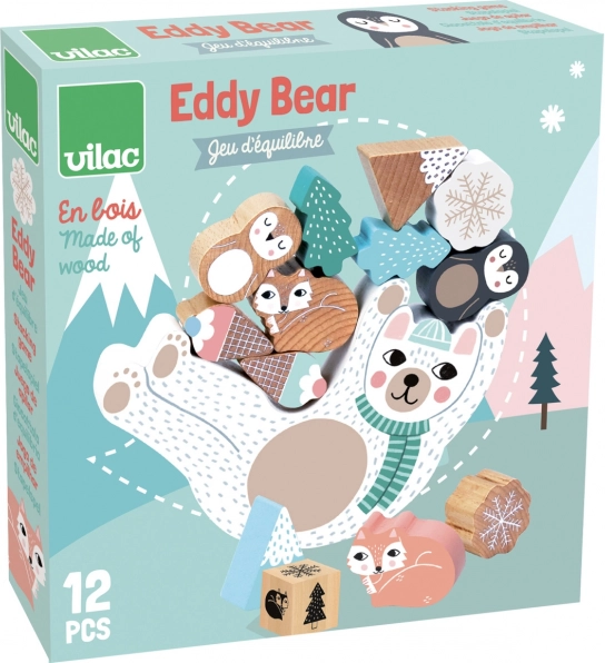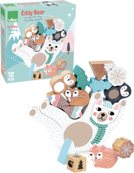 Az Eddy mackós egyensúlyozó játék finom skandináv tónusaival szórakozást nyújt gyerekeknek és szülőknek egyaránt. A gyerekek színes kockával dobnak, és a kapott szín szerint teszik a fa elemeket a hintázó mackóra. A játék fejleszti a kézügyességet, a koncentrációt és az egyensúlyt, miközben támogatja a türelmet és a logikus gondolkodást is.
