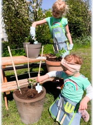 A készlet része a kesztyű, amely védi a gyerekek kezeit, valamint a kötény, amely megóvja a ruhát a kertészkedés és az alkotás közben.