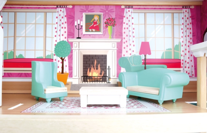 Bino háromszintes fa babaház lifttel és 13 kiegészítővel