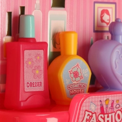 - Gazdag kiegészítő-készlet: tükör, fésű, gyerek „hajszárító”, csatok, gyűrűk, karkötők, matricák és üvegcsék, amelyek körömlakkot és parfümöt imitálnak.