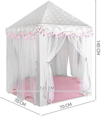A tágas alátét és a levegős oldalfalak kényelmet biztosítanak egy vagy több gyermek számára – elfér benne sok párna, plüssjáték és könyv. A sátor beltérre és kertbe is kiváló, felnőtt felügyelete mellett. A dekoratív pomponok és a függönyök masnira köthetősége extra játékosságot és intimitást ad.
