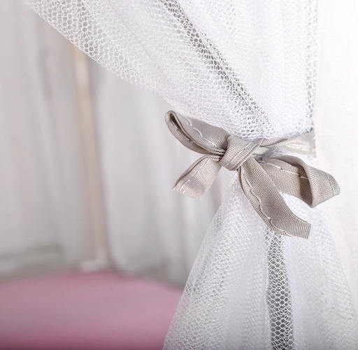 A hat bejárat világos, félig áttetsző függönyei behúzhatók és masnira köthetők. A gyerekeknek elegendő fényt, levegőt és biztonságérzetet nyújt.