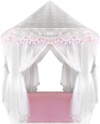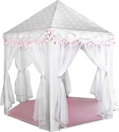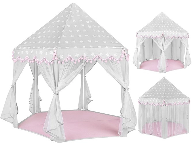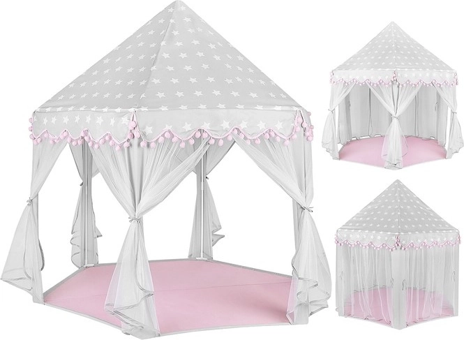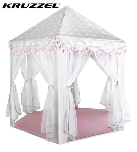 A varázslatos, szürke–rózsaszín Kruzzel gyereksátor csillagmintával mesés menedékké változtat minden szobát. Kínál tágas, hatszögletű alaprajzot, 6 bejáratot könnyű függönyökkel, szerszám nélküli, egyszerű összeszerelést és dekoratív pomponokat a még varázslatosabb játékért.