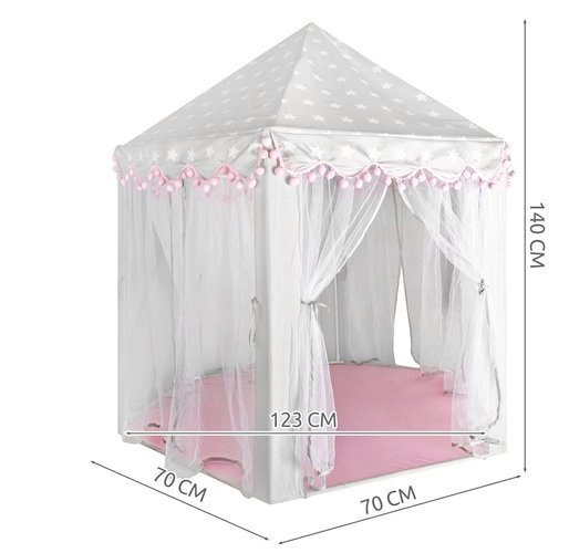 Alkossanak a gyerekeknek biztonságos kuckót pihenéshez és fantáziadús játékhoz. A sátor kúpos tetővel, 6 nyitott bejárattal rendelkezik világos, légáteresztő függönyökkel, valamint stílusos szürke–rózsaszín, csillagos dizájnnal, amely illik a gyerekszobába és a játszósarokba is. A könnyű, bepattintható szerkezetnek köszönhetően pillanatok alatt összerakható, és ugyanilyen könnyen áthelyezhető vagy elpakolható.