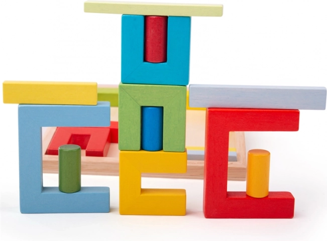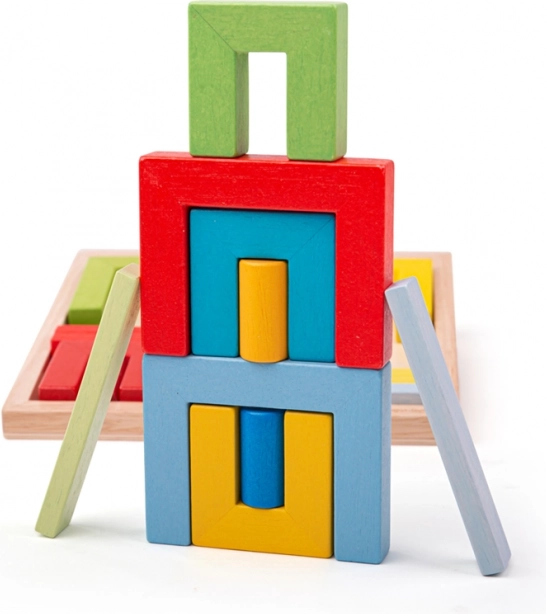 Okos fa építőformák kis építőknek 3 éves kortól. Nyitott végű játék színes, minőségi fából készült elemekkel, amely fejleszti a finommotorikát, a térérzékelést és a színek felismerését. Biztonságos anyagokból készült, amelyek megfelelnek az európai biztonsági szabványoknak.