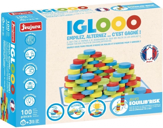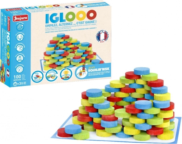 A Jeujura Igloo fa építőkészlettel a kis építők elkezdhetik létrehozni a szilárd és stílusos építményt. Ez a játék támogatja a koncentrációs képességet és a finom motorikus készségeket, ideális hároméves kortól. Az építőkészlet gondosan készül bükk- és fenyőfából, amely Franciaországból származik. Minden darabot biztonságos, vízbázisú festékkel festenek be, ami összhangban van az ökológiai normákkal.