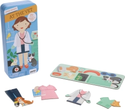 Mágneses készlet kis állatorvosoknak számos mágneses ruhadarabot és szakmai felszerelést kínál, amelyek együtt a belső térbeli jelenetekkel praktikus úti készletet alkotnak. Támogatja a kreativitást és a szórakoztató játékot bárhol.