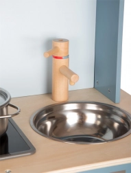Stílusos és tartós gyerek fa konyha füstös kék színben, bőr fogantyúkkal. A készlet része fém konyhai eszközök és edények, beleértve a fazekat és serpenyőt, melyek valósághű főzési és szervezési élményt nyújtanak.