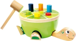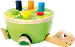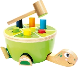 Szórakoztató fa kalapálójáték teknős formában, amely fejleszti a gyerekek finommotorikáját, a kéz–szem koordinációt és a koncentrációt. A színes pálcikákat a páncélba kell beütögetni egy filcborítású kalapáccsal a csendesebb játék érdekében, miközben a teknős „életre kel”: mozognak a lábai és a feje – nagyszerű módja a kíváncsiság és a felfedezés örömének ösztönzésére.