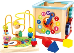 Fedezze fel a legkisebbeknek szánt szórakoztató és fejlesztő játékot: fa motorikus kocka órával, gyöngylabirintussal és minden oldalon új aktivitással. Támogatja a finommotorikát, a logikus gondolkodást, a színek és formák felismerését, valamint a kéz–szem koordinációt.