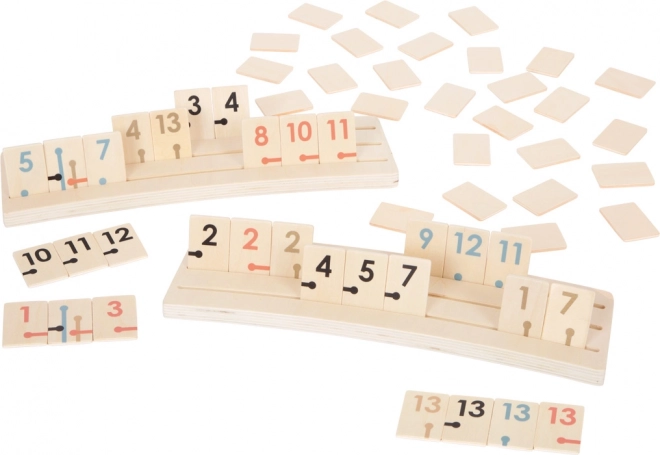A masszív fa lapkák számozott nyomattal és szimbólumokkal jól olvashatók és kellemes tapintásúak. A kombinációk kirakásakor a enyhén ívelt fa tartók gondoskodnak a stabilitásról és a diszkrécióról. A játék fejleszti a logikus gondolkodást, a stratégiát és a koncentrációt minden korosztály számára.