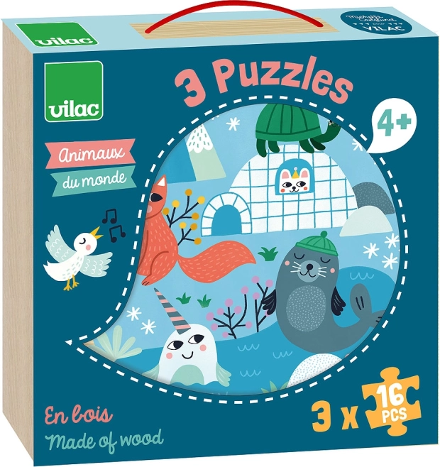 Három képes puzzle szavannai, erdei és jégpados motívumokkal mutatja be a gyerekeknek az állatok világát természetes környezetükben.