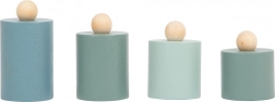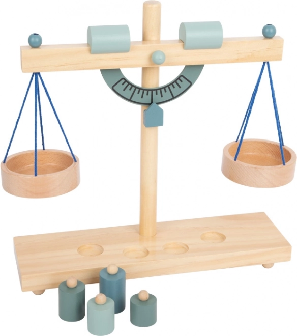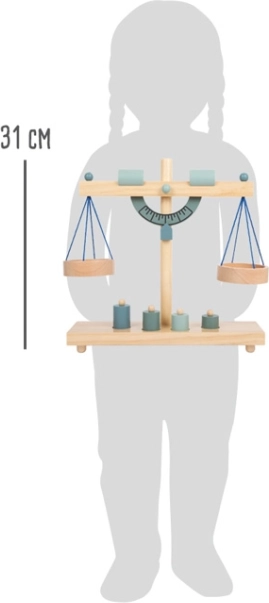 A gyerekek könnyen megértik a kiegyensúlyozás elvét a két serpenyőnek és a különböző tömegű, fa súlyoknak köszönhetően.