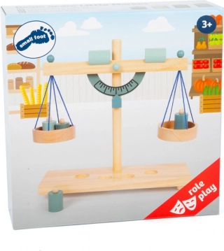 Ez a stabil, fa serpenyős mérleg ideális a gyerekboltba és a játék konyhába is. A két felfüggesztett serpenyő és a négy fa súly készlete lehetővé teszi, hogy a gyerekek pontosan „lemérjék az árut”, és megértsék, hogyan működik az egyensúly. A karokon található csúsztatható ellensúlyok a finom beállítást szolgálják – remek módja a türelem és a koncentráció gyakorlásának.