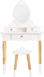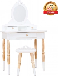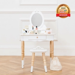 Gyönyörű, retró stílusú fésülködőasztal, amely sok gyermek álmát valóra váltja. Remekül mutat a gyerekszobában vagy a játszószobában, nagyon elegáns, és játék közben igazán felkelti a gyerekek figyelmét. Viktoriánus, ovális tükör első osztályú, törhetetlen akrilból, kétpolcos asztal, 3 fiók – tökéletes kincsek és apróságok elrejtésére. Tehetséges játékkészítők csapata készítette fenntartható gumifa felhasználásával, a gyönyörű darab nagy hangsúlyt fektet a részletekre. Az asztal és a szék lábai érdekes formájúak. Fehér és natúr fa kombinációja az időtálló megjelenésért. A szép bútordarabot akár generációról generációra is továbbadhatják. Főbb jellemzők: fésülködőasztal székkel 3–6 éves gyerekeknek, maximális teherbírás 50 kg, etikusan, fenntartható fából készül, vízbázisú, nem toxikus festékekkel festve. Játékdíj: Independent Toy Gold Award Winner 2022. Honeybake kollekció: A kollekció játékai felfedezésre ösztönöznek, segítik a gyerekeket a képzelőerő, a szociális és verbális készségek, valamint a kognitív funkciók fejlesztésében. A hagyományos dizájnt modern részletek egészítik ki, ami biztosan tetszeni fog a gyerekeknek. A Honeybake a Le Toy Van legtöbb díjat nyert kollekciója, amelyet a dizájnért, minőségért, biztonságért, valamint az oktatási és játékértékért ismertek el.