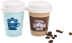 Két részletgazdag pohár „Fresh Coffee” és „Tea” felirattal, fehér fedőkkel, amelyek igazi kávézós és teázós hangulatot kölcsönöznek a játékoknak.