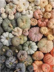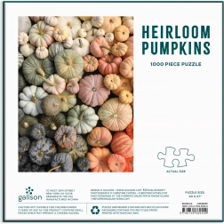 A Christine Chitnis által tervezett „Heirloom Pumpkins” motívum lila, zöld, sárga és narancs dísztökök gazdag palettáját hozza el. A puzzle matt, masszív dobozban érkezik, amely ajándékcsomagolásként vagy stílusos tárolódobozként is kiváló. A csomag tartalmaz egy teljes színes mintaképet is a kész képről.