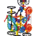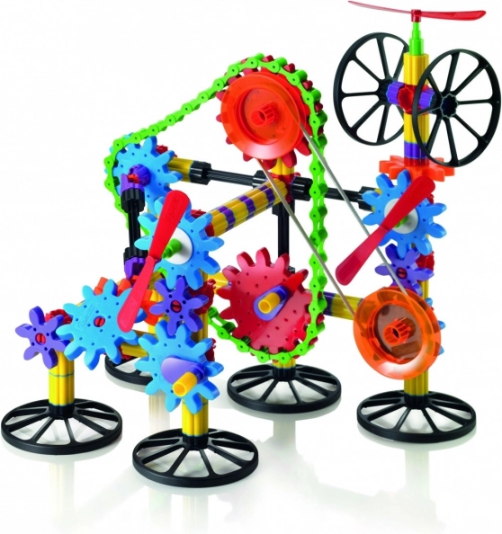 Kösse össze a fogaskerekeket, a láncot és a rugalmas szíjat, és figyelje, hogyan adódik át a forgó mozgás távolabbi pontokra is. Remek bevezetés a technika világába.