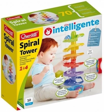 A Quercetti Spiral Tower remek játék a motoros készségek fejlesztésére és a szórakozásra. Az 1–4 éves gyerekek színes elemekből magas spirális tornyokat építhetnek, és figyelhetik, ahogy a csörgő gyöngyökkel teli golyók legurulnak. A játék leköti a figyelmüket és támogatja a kéz és szem koordinációját.