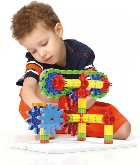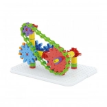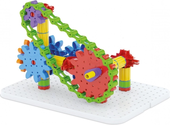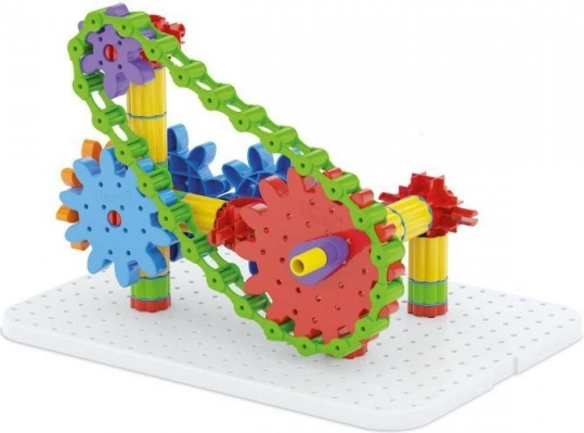 Az építőkészlet tartós műanyagból készült, és 5 éves kortól ajánlott. Tartalmazza a fehér alaplemezt, különféle méretű fogaskerekeket, láncot és még sok mást, lehetővé téve a gyerekek számára, hogy felfedezzék a mechanikai mozgás új világát.