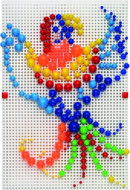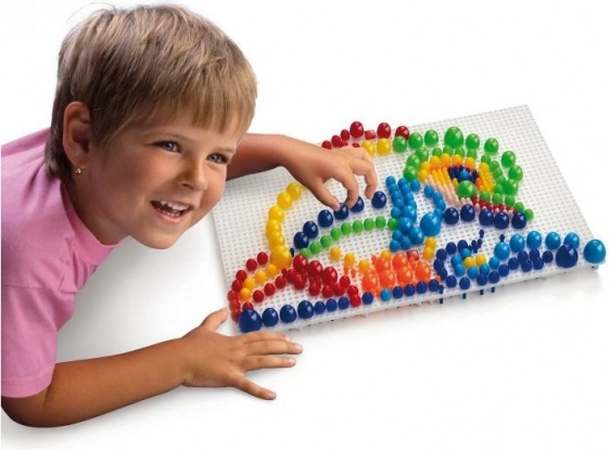 Quercetti Fanta Color Modular egy oktatási játék 4 és 8 év közötti gyerekek számára, amely a kreativitást és a kézügyességet támogatja vidám, színes pötyik segítségével történő mozaikok készítése által.