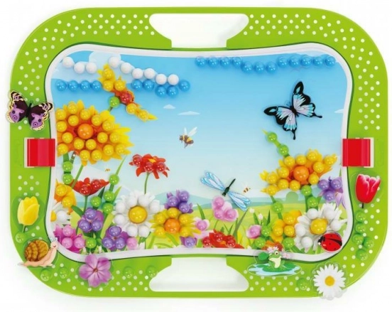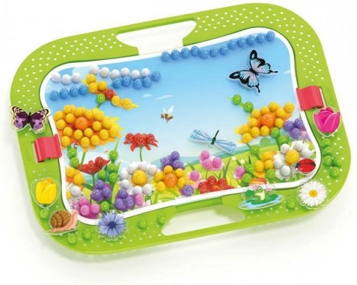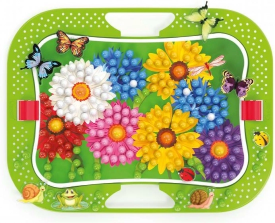 Készíts virágzó kertet színes szegecsekkel! A klasszikus Quercetti szegecsek a természet világát bemutató, színes változatban. A készlet különböző színű és átmérőjű szegecseket tartalmaz, melyek behelyezésével változatos tájképeket alkothatsz, valamint rengeteg matricát és pillangó-, béka-, katicabogár- és más figurát, amelyekkel benépesítheted saját természeti világodat. A csomag tartalma: 1 lyukacsos alaplap 28 × 20 cm, 2 mintakép, 300 szegecs 6 különböző színben, 16 figura, 1 talp állvánnyal, 1 fából készült szúró toll. Főbb jellemzők: fejleszti a finommotorikát, a kreativitást és a fantáziát, 316 gombot tartalmaz, 3 éves kortól ajánlott.