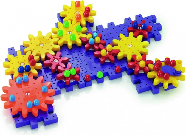 A színes fogaskerekek és figurák készlete lehetővé teszik a gyerekeknek, hogy különböző szerkezeteket alkossanak, miközben szórakoztató módon sajátítják el a mechanika alapjait.