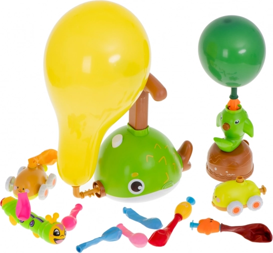 A készlet tartalmaz pumpát, 2 kisautót, 12 lufit és mókás kiegészítőket (aranyos tengeri motívumok, síp, labda stb.). Ideális versenyekhez és kreatív játékokhoz.