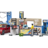 A csomag része egy variálható sportautó levehető kerekekkel és tetővel, amely teljes mértékben kompatibilis a BRUDER BWORLD figuráival és kiegészítőivel. A kétoldalas nyomtatott díszletek, a polcok kannákkal és az árlista támogatják a kreatív és tanulságos játékot.