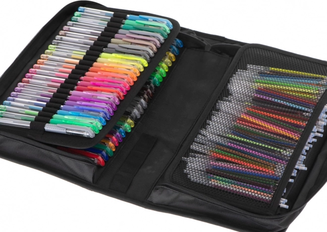 Textil cipzáras tok gumipántokkal és hálós zsebekkel, amelyben mind a 120 toll biztonságosan és rendezetten egy helyen tartható – ideális otthonra és utazáshoz.