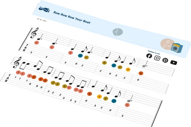 A csomagban egyszerű kottát és két különböző méretű pengetőt találsz, hogy a gyerekek a kibontás után azonnal játszhassanak.