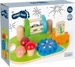 A fa tábla különféle mozgó elemeket, mint például fogaskerekeket és szivacsokat kínál a finommotorika fejlesztésére.