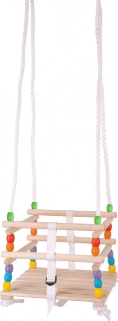 Első gyermekhinta minőségi fából, stabil szerkezettel, színes gyöngyökkel és biztonsági hevederrel. A kötél akár 1,12 m-ig állítható, teherbírása 25 kg. Kertbe és teraszra ideális, megfelel az európai biztonsági szabványoknak.