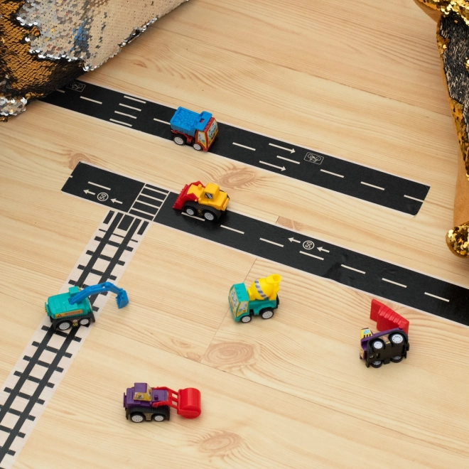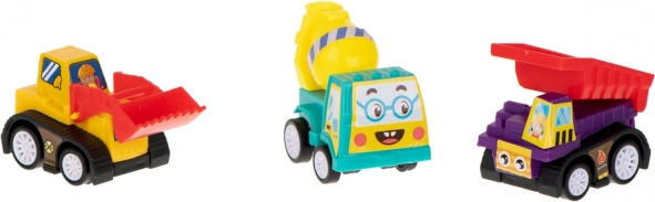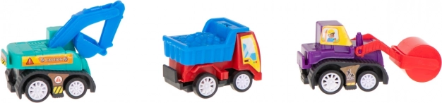 A készlet különféle típusú építőipari járműveket tartalmaz, mint például betonkeverő, henger, két billenő, markoló és buldózer.