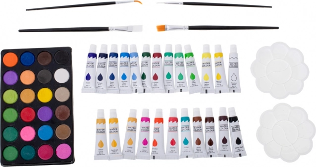 Paletta 24 akvarellfestékkel, 24 tubusos festék, ecsetek és két műanyag paletta – teljes felszerelés vízfestéshez és fedőtechnikákhoz.