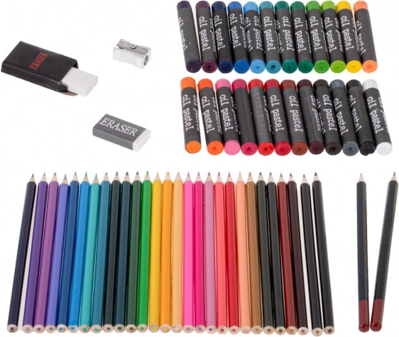 33× filctoll, 28× színes ceruza, 4× ecset, 2× grafitceruza, 2× radír, 2× műanyag paletta, 1× hegyező, 24× akvarellfesték (paletta), 24× tubusos festék, 24× olajpasztell, 1× bőrönd