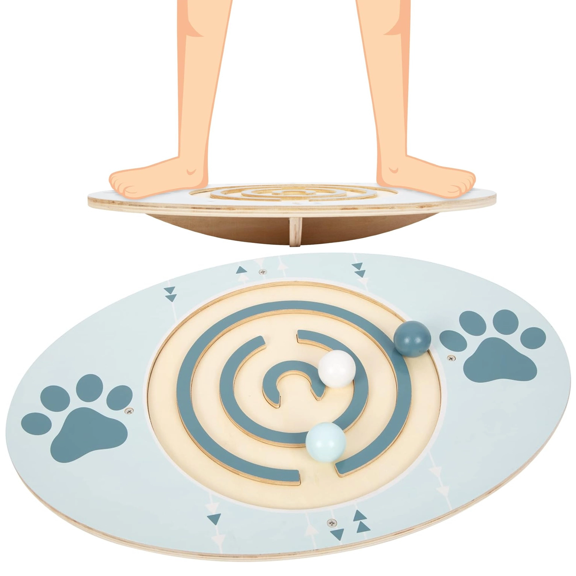 A Small Foot fa egyensúlyozó deszka játékot és mozgást egyesít. Az ovális felület spirális pályával és szabadon mozgó golyókkal próbára teszi az egyensúlyt – a deszka billentésével a golyókat a labirintuson vezeti, miközben fejleszti a kéz–szem koordinációt, a megfigyelőképességet és a stabilitást.