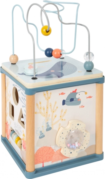 Ez a tengeri világ motívumú fa aktivitáskocka öt oldalnyi izgalmas tevékenységet és ráadásként mágneses horgászatot kínál – a berakó elemei mágneses horgászbottal közvetlenül a kocka belsejében foghatók ki. A színes tengeri illusztrációk fejlesztik a vizuális észlelést, a rugalmas polip pedig játékos elemmel motivál további felfedezésekre.