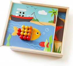 Fedezze fel a tengerparti motívumú, szórakoztató mozaikot, amely fejleszti a gyerekek fantáziáját és készségeit. Tartalmaz 4 képet és 96 pöcköt 8 színben, amelyeket a praktikus doboz fedelére lehet kirakni. A játék támogatja a színek felismerését, a finommotorikát, a koncentrációt és a logikus gondolkodást. Minőségi, felelősen beszerzett fából készült – kellemes tapintású és ideális utazáshoz.