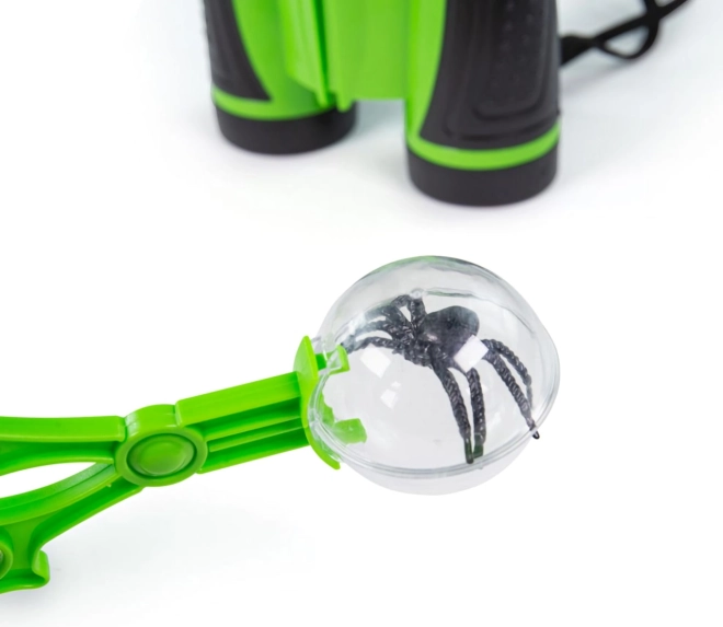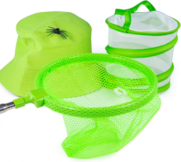 Háló, zsákmánytartó doboz, nagyító, rovarfogó csipesz, távcső és kalap – teljes felszerelés a rovarok biztonságos befogásához és a természet megfigyeléséhez.