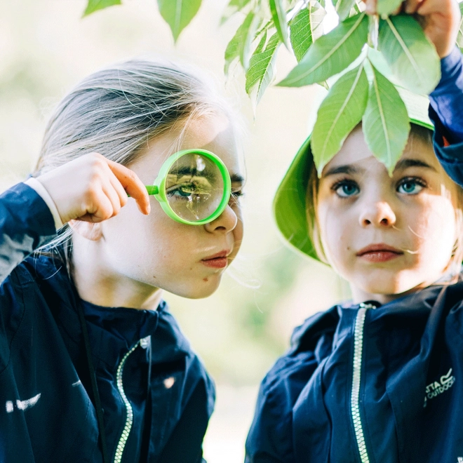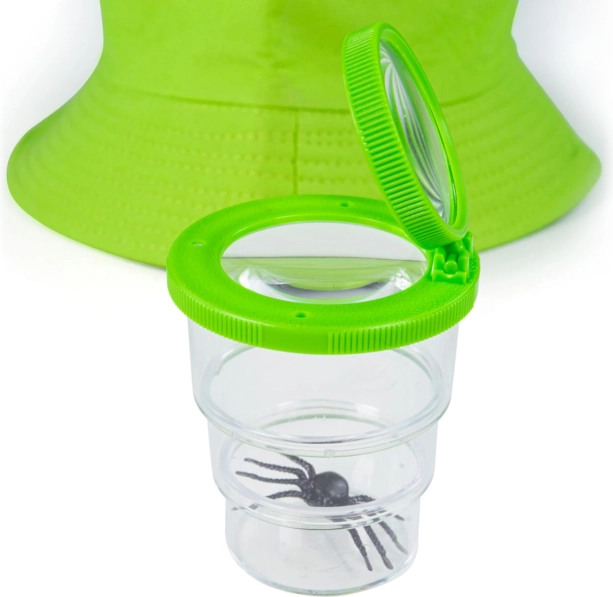 A nagyító és a tetővel ellátott, átlátszó tartály lehetővé teszi, hogy a gyerekek egészen közelről vizsgálják a részleteket, miközben kíméletesek maradnak a természethez.