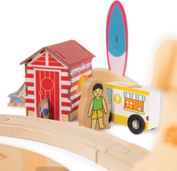 Ez a tengerparti vonatpálya rengeteg ötletes szórakozást és tanulást kínál egyben. A gyerekek körözhetnek a pályán, áthaladhatnak a nagy homokváron, elhaladhatnak a színes tengerparti házikók mellett, miközben a hulladék szelektálását is gyakorolják a praktikus mágneses zárótábláknak köszönhetően. Mindez minőségi kivitelben, felelősen beszerzett anyagokból, ártalmatlan festékekkel és lakokkal.