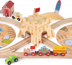 - Komplex, 70 darabos szett – pálya, vonat, autók, épületek, fák és kiegészítők.