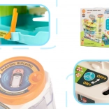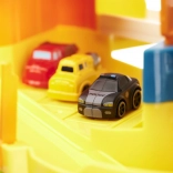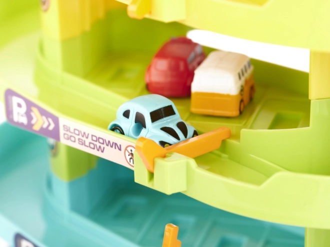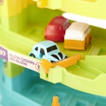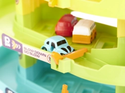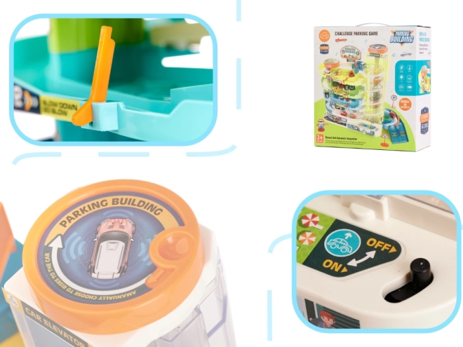 A kisautókat egy gombnyomással a tetőre emelheted – a liftet fények és vidám dallam kíséri. Áramkimaradáskor kézzel is működtethető, így a játék sosem áll meg.