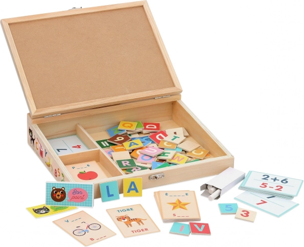 Merüljön el az iskolás évek nosztalgiájában a Vilac varázslatos táblájával, amelyet Ingela P. Arrhenius művész illusztrált. Ez a masszív, fából készült szekrénytábla gazdag felszereltséget kínál az írás, a számolás és az angol, illetve francia nyelv alapjainak elsajátításához. A 70 fa elemmel (betűk és számok), 80 szókártyával, 30 példakártyával és 12 pontozókártyával a gyerekek játékosan tanulnak. A csomag része 2 kréta is, így a tábla azonnal használatra kész.