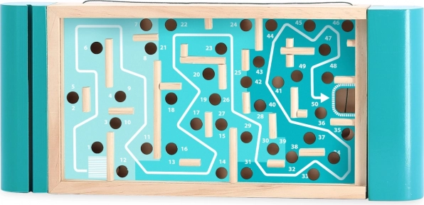 A kétoldalas kialakítás kettős élményt nyújt: a golyó precíz vezetését a pályákon karokkal, valamint az intuitív egyensúlyozást a teljes tábla döntésével. Az átgondolt konstrukciónak köszönhetően a fedél játék közben támaszként is szolgál, a termék pedig könnyen hordozható és jól tárolható.