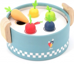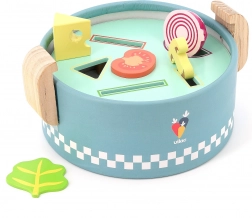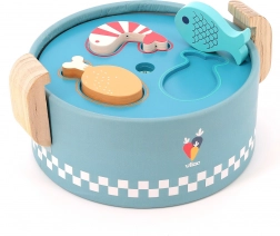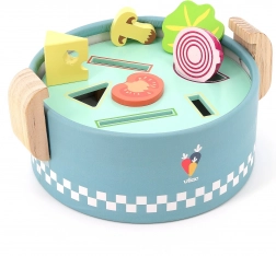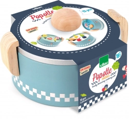 A VILAC bedobós mini fazék okos fa játék a legkisebbeknek, 18 hónapos kortól. A fedél alatt három cserélhető lap található különböző formákkal, amelyekbe a gyerekek színes ételdarabokat helyeznek vagy dobnak. Így lesz belőle igazi „főzés”, amely fejleszti a fantáziát és a gyakorlati készségeket.